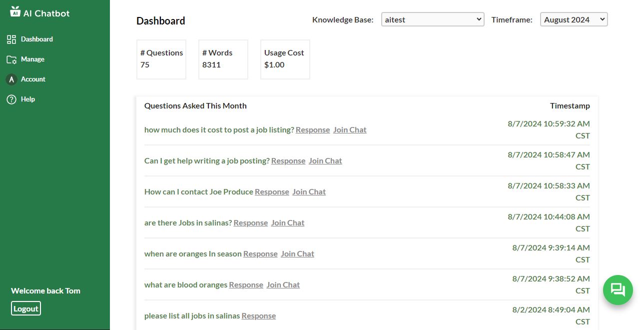 The Dashboard screen is a window to your system’s activity. There are three major sections of the dashboard: a filter to choose which knowledge base and month is shown, a readout on the number of questions, words, and usage, and a list of questions answered for the selected knowledge base and month.