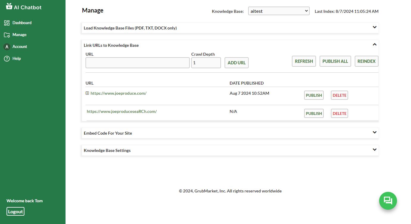 Once pages are added, you may selectively publish or delete pages from the knowledge base. When pages are published, the system gathers all the information on the web page and transfers it to the knowledge base. A complex set of processes is performed after publishing to incorporate the uploaded information into the knowledge base. Please allow up to 60 minutes for the process to complete. You may use the Chat icon in the lower right corner to test the addition of your information to the knowledge base.